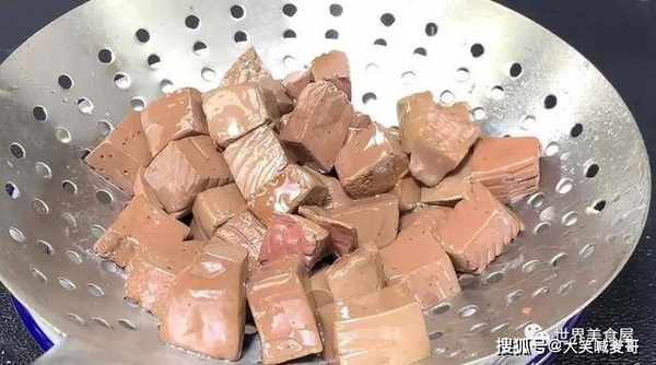 6、猪血焯水1分钟后捞起,放在凉水中洗一下,可以变得更加爽滑结实。