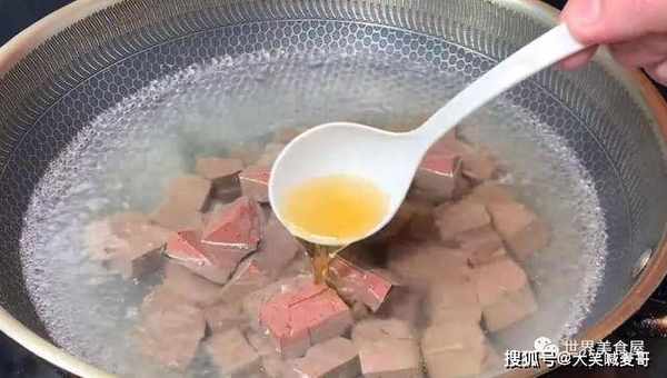 5、烧开热水,放一勺食盐调底味,倒入猪血,还要放一勺料酒去腥。