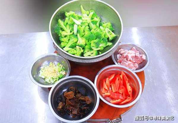 1.准备适量的木耳,放入清水中泡发;西蓝花一朵,切成小块放在清水中洗干净;五花肉一块,切成均匀的薄片;再切点葱花、蒜末、红椒片备用。