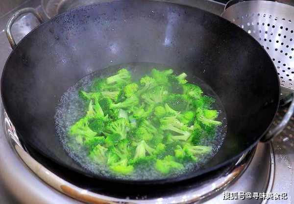 2.锅中水烧开以后,加入一勺食盐入底味,把西蓝花倒入锅中烫30秒钟,西蓝花返青以后倒出来,过一下凉水以免回软。