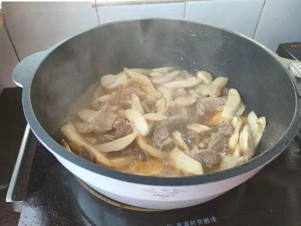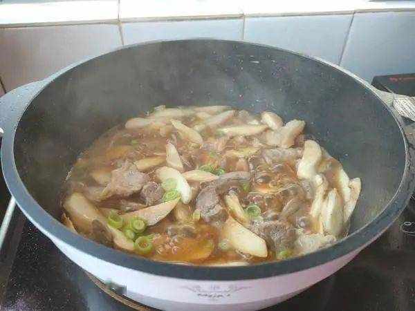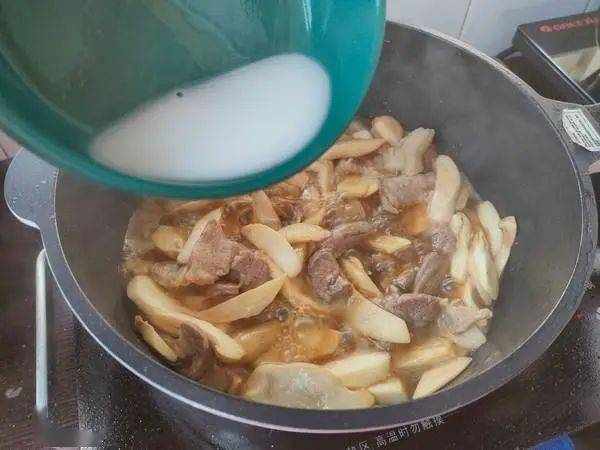 3.下入鸡腿菇,高汤也一并倒入锅内,再次炒匀。