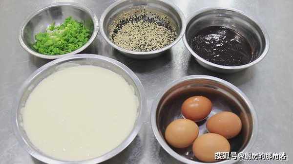 另外还需要准备4个鸡蛋, 一小盆甜面酱。白芝麻和黑芝麻 ,食材全部准备好。