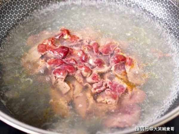 5.烧一锅开水,水开放一勺食盐,倒入腌制好的鸡肝焯水。