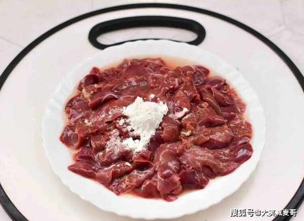 3.切好的鸡肝继续用面粉抓洗几遍,洗去血水,然后开始腌制,先加一勺淀粉。