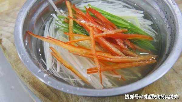 4.青椒、红椒一个,先去籽,然后接着平铺切成细丝。和葱姜一起,泡在水中。
