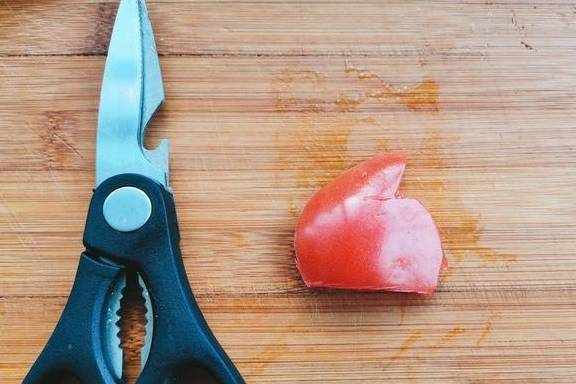 (2)把西红柿用刀子一点一点划出帽子的形状,刀口不用太深,如下图所示的形状就可以。