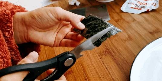 (4)接下来就是胡子了,把剩下的米饭围在四周,不用刻意按压,零零散散的看起来更形象哦!然后用海苔剪出圣诞老人的眼睛,胡萝卜当作鼻子。我们的圣诞老人就制作完成啦!