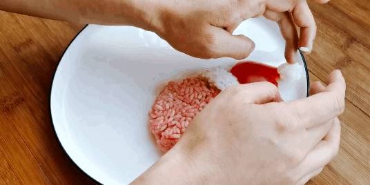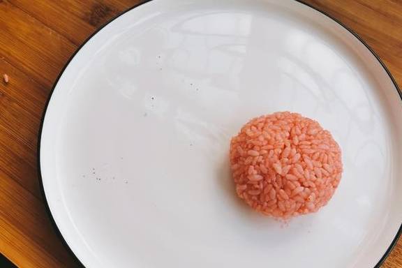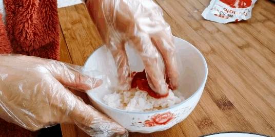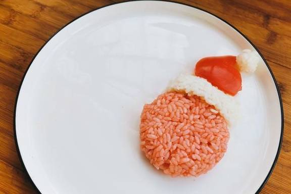 (1)取一坨蒸好的米饭,把番茄酱和米饭混合均匀,拌成淡红色的番茄米饭,然后搓成圆球再压扁,放在大一点的盘子上,这就是圣诞老人的脸。