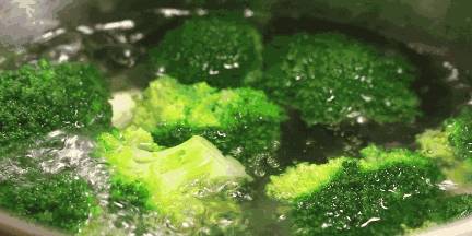 (6)锅内烧开水,加入一勺盐,把西兰花焯水1分钟,然后迅速过一遍凉水,这样可以保持西兰花在色泽上更加翠绿,之后控干水分备用。