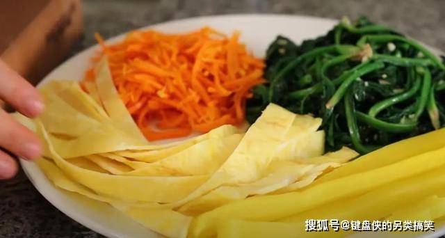 2、胡萝卜、菠菜焯水煮熟备用。瘦肉丝炒熟备用。鸡蛋打开,煎熟后切丝备用。