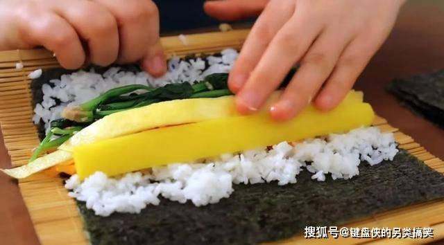 4、在桌面平铺紫菜,然后依次放米饭、胡萝卜丝、酸黄瓜丝、菠菜、蛋丝、瘦肉等,将紫菜卷起来,最后切块,紫菜卷就完成。