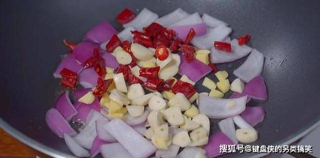 5.另起锅烧油,放入洋葱块,姜蒜片,干辣椒,煸炒出香味。