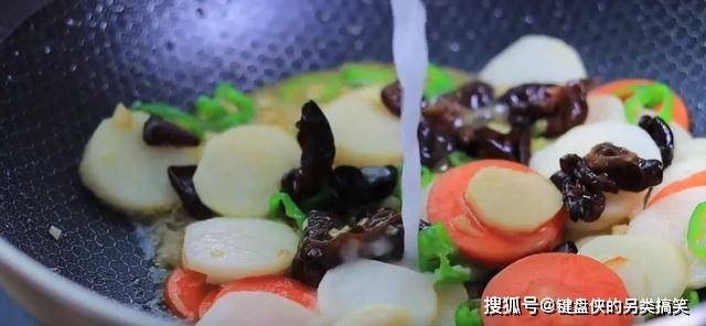 7.加适量清水、食盐、鸡精、生抽,炒匀。