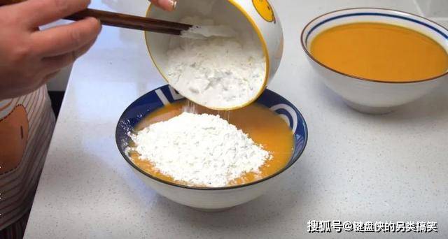 4.打好的红薯汁分装入2个碗中,其中一碗中加120克红薯淀粉,搅成面粉水备用。