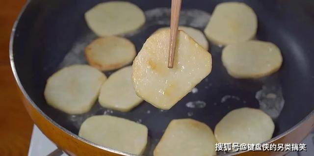 4.不粘锅中加食用油,放入土豆片,中小火慢煎,两面煎至金黄,盛出备用。