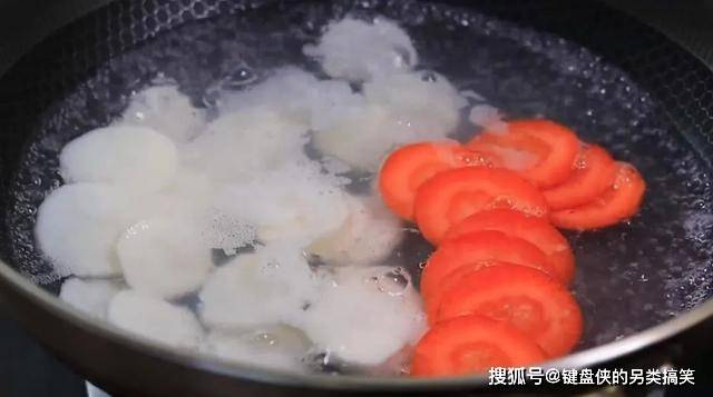 3.起锅烧水,水开放一勺食盐,下入山药片、胡萝卜片焯水一分钟。