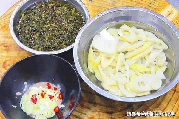 首先我们准备嫩笋芽200克,斜刀切成片用清水洗干净;腌好的雪里蕻200克,切成小段,放清水里浸泡一会,去除咸菜雪里蕻本身的盐味和杂质;大蒜切成碎末,大葱切成马蹄片,小米椒切成辣椒圈,与葱蒜放在一起备用。