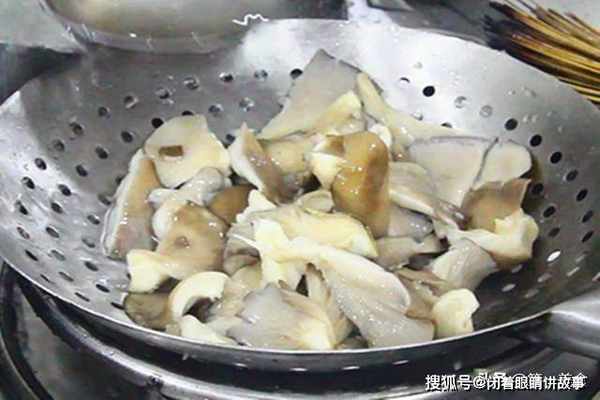 锅里烧水,开锅以后倒入平菇,快速焯水1分钟左右去杂质和异味,然后倒出来用清水冲洗干净、沥水备用。