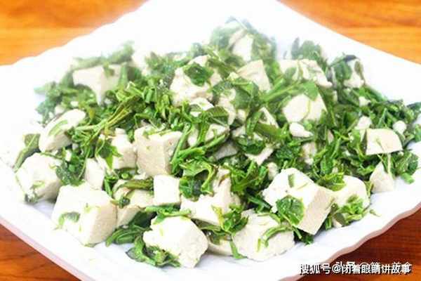 然后把香椿挤干水分、切成碎丁放入盆中,浇上200度的热油把香味激发出来,稍微加一点食盐调味,然后把豆腐放进去,轻轻的拌匀就能装盘了,不要来回颠,不然豆腐都碎了。
