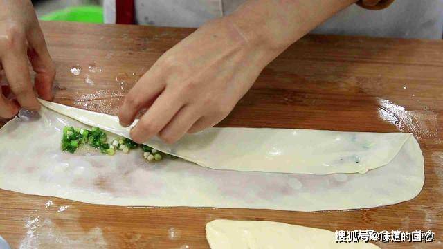7.10分钟以后,取出面剂子,放在案板上面拉伸成一个片,再擀薄些,把葱花均匀的抹在面皮中间,从两边把面皮包着葱花折起来,然后再从一头往另一头卷。