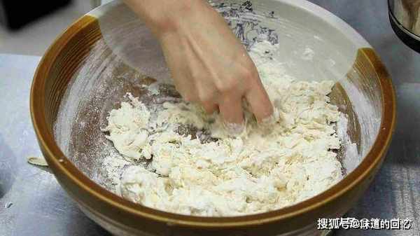 2.普通面粉200克,加入食盐2克,倒入30度的温水,边倒边用手搅拌,先把面粉搅成面絮,倒入植物油10克,倒入植物油不但是为了起酥,揉面的时候还不容易粘手。