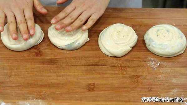 8.照着这个方式,再卷上一条,然后把两条面卷并排放在一起,卷起来把收口朝下放,用手轻轻按一按,按圆一点,这样做出来的饼层次分明。