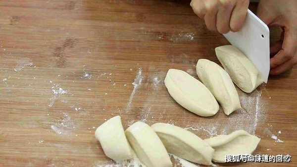 4.面团松弛好后,我们取出面团,在案板上面搓揉一会 把面团搓揉光滑,切成几个均等的面剂子,把每个小面剂子都揉一揉,搓成长条形的面剂子。