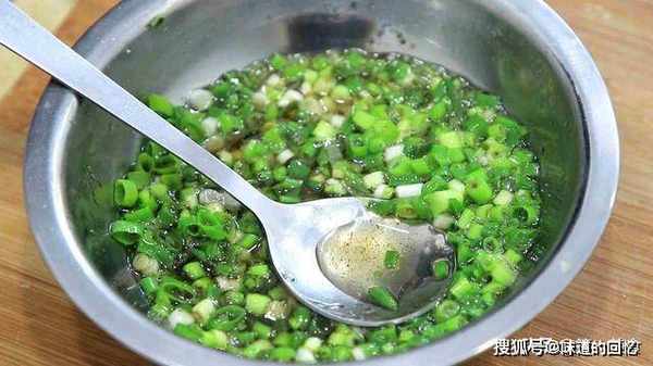 6.这个时间我们把葱花调一下味,倒入五香粉2克,食盐2克,再起锅烧点植物油,油烧七成热时倒在葱花上面,把葱花激出香味。