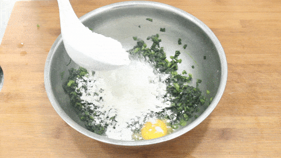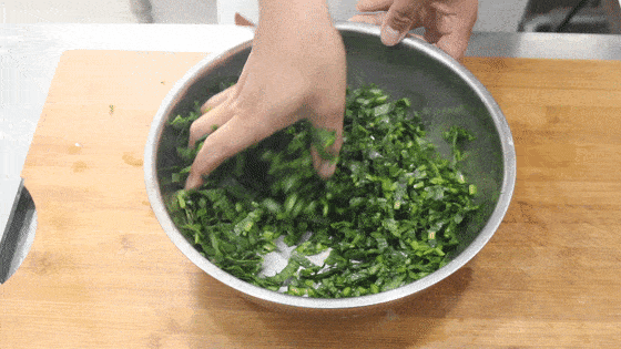 准备洗净的菠菜一把,切成碎末,放入盆中,加入食盐2克,鸡粉1克,十三香1克,使劲抓揉一会,杀出菠菜中的水分,防止烙制时菠菜大量出水~