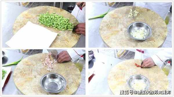 1.我们准备一下食材,四季豆一把,切成一厘米左右的丁段。葱白一段,切成碎粒,大蒜粒四个,切成碎粒,小米椒两粒,切成宽圈。猪瘦肉一小块,切成肉末,放在盆中备用。
