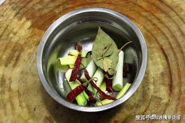 葱白一根、切成小段,生姜一小块、切成姜片,一起装入盆中,再抓入八角3粒、干辣椒5克、香叶2片备用,这里香料稍微放一些就可以了,太多的话会影响豌豆的清香。