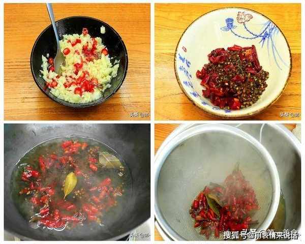 小米椒切成粒,大蒜切成末,然后倒入7成热的热油,激发出香味。