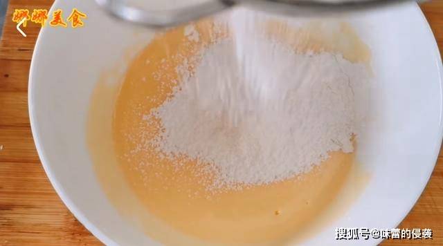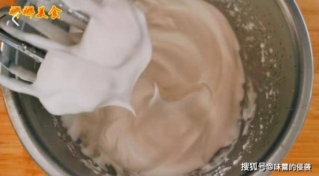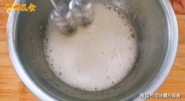 接下来我们来处理蛋清,用电动打蛋器打发,20克白糖可以分三次加入,第一次的状态是有大泡的时候,第二次是有密集的小泡时,最后一次是在蛋清有纹路的时候,直到打到蛋白有小弯钩就行了.