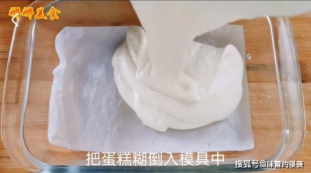 把打好的蛋白和蛋黄糊分两次翻拌在一起,一定不要划圈搅拌,很容易消泡,翻拌好的蛋糕糊非常细腻,颜色均匀即可,不要过度搅拌.准备一个模具,底部铺上油纸防粘,接着把蛋糕糊倒进来,表面整理平整,有条件的可以加几颗红枣,这样更好看一些.