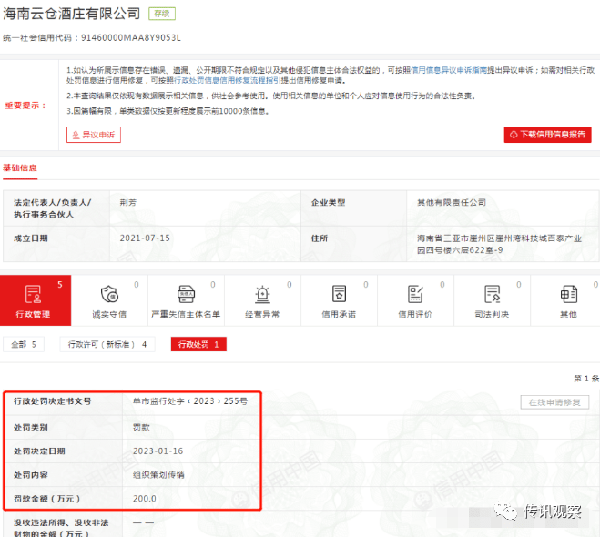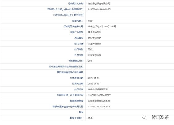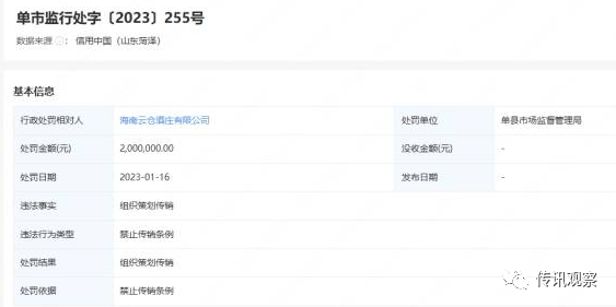 据北青网报道,日前,海南云仓酒庄有限公司(简称:云仓酒庄)因组织策划传销,被山东省菏泽市单县市场监督管理局罚款人民币200万元。该处罚信息为:单市监行处字〔2023〕255号,处罚决定日期为2023年1月16日。