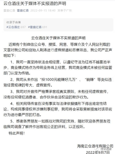 在此次被罚之前云仓酒庄官方发布了一条声明: