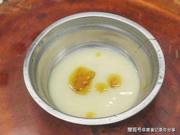 另准备一个碗,打入一个鸡蛋,抓入两把淀粉,一小撮面粉、一点泡发粉、半勺食用油,清水分次添加,把面糊调成酸奶糊就可以了。