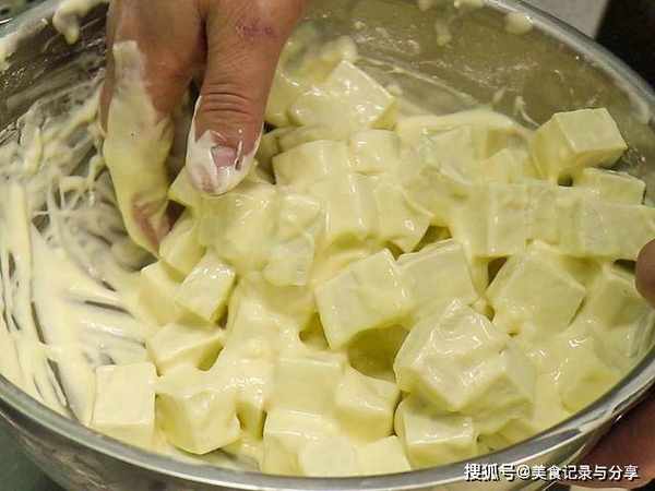 起锅烧水,加点食盐增加底味,水烧开以后把豆腐倒进去煮个3分钟左右去豆腥味,时间到倒出来控水,把控过水的豆腐,放到脆皮糊里面,让每一块豆腐都裹上糊。