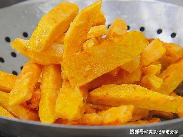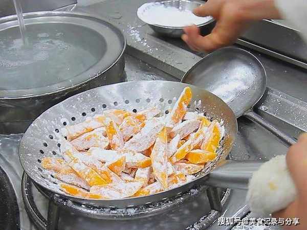 锅内烧宽油,油烧至5成热(微微冒烟时),倒入南瓜开小火慢慢炸2分钟左右,炸至南瓜呈金黄色,外皮酥脆的时候倒出控油了。