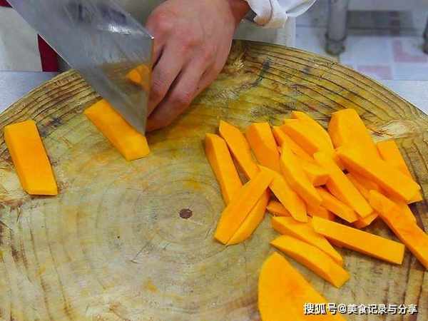 半个南瓜削皮,去瓜瓤后切成3厘米左右的粗条;两个咸鸭蛋黄切碎;两根小葱切成葱花备用。