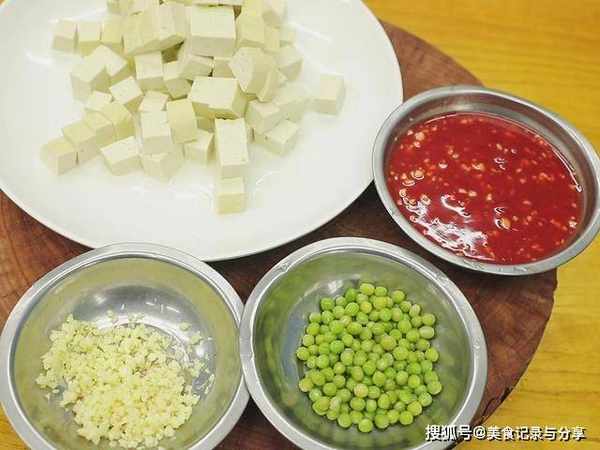 一块老豆腐切成1.5厘米见方的骰子丁;一把大蒜切成蒜末;一把青豆煮熟备用;