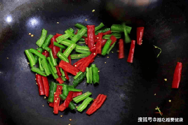 把锅烧热、不用放油,直接倒入准备好的青红辣椒开小火煸炒,去除里面的水分,辣椒塌架、闻到浓郁的香辣味以后盛出来备用。