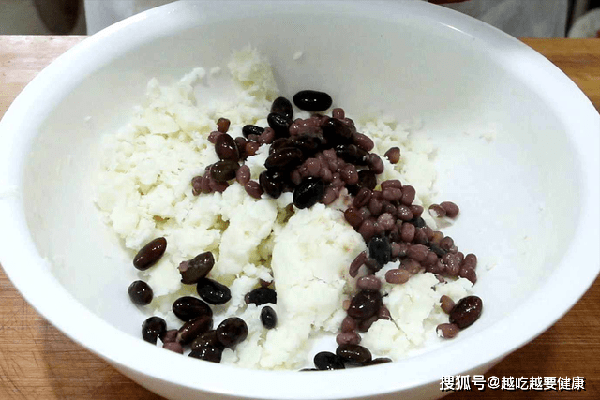 锅内再烧水,山药放入篦子中,大火把水烧开转小火蒸15分钟,蒸熟后取出。山药放在盆中用勺子摁压成山药泥,加入少许植物油拌匀;再加入煮好的红豆、黑豆抓拌均匀;准备一个盘子,铺一层保鲜膜备用。