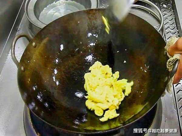 热锅凉油,倒入鸡蛋,开中火把鸡蛋炒成块儿,然后倒出来控去多余的油。