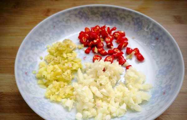 6、将生姜去皮切姜末,大蒜拍扁去皮后剁碎,小米椒切成小圈,装入盘子。