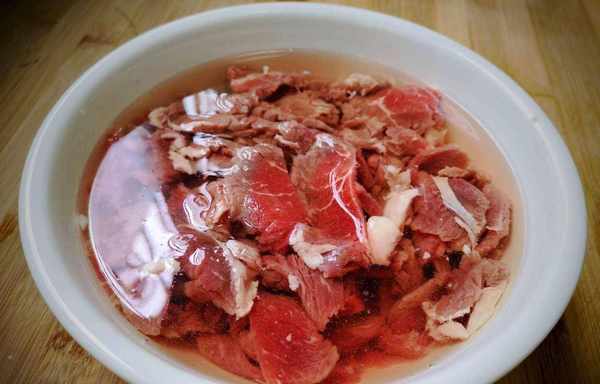 2、牛肉切薄片,放入清水中浸泡片刻抓捏挤掉血水。