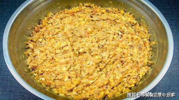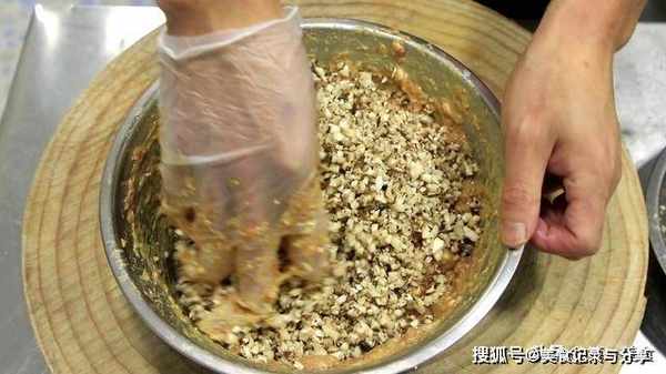 肉馅搅拌好以后,倒入香菇粒,用手把香菇粒和肉馅抓匀搅拌 ,搅拌到香菇粒和肉馅充分融合。