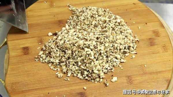 接着把香菇处理一下,香菇去掉香菇根,放在盆中用清水清洗,挤干水分以后放在案板上面,先把香菇一个一个都切成薄片,再剁成香菇粒,放在盆中。