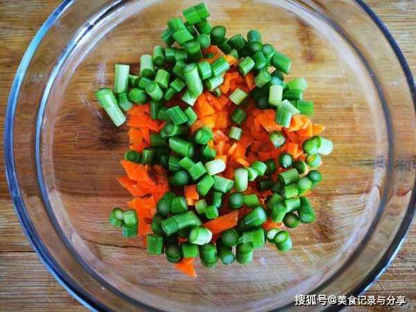 2、醒面的时候,我们来准备配菜,胡萝卜去皮洗净切小丁,蒜苔洗净切碎,放入小碗中。