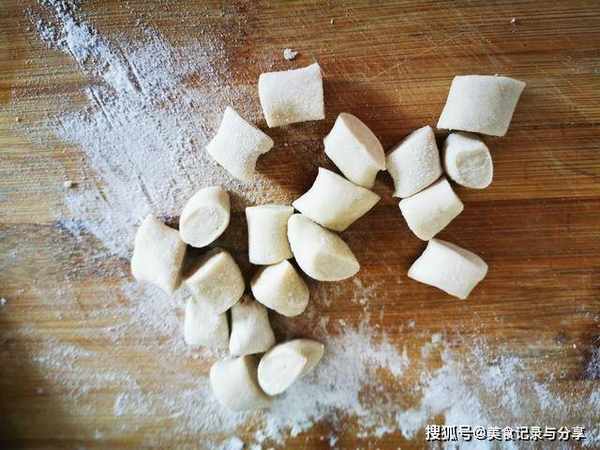 5、切成一个个大小比较均匀的小块,切好之后,撒些干面粉防止粘连。